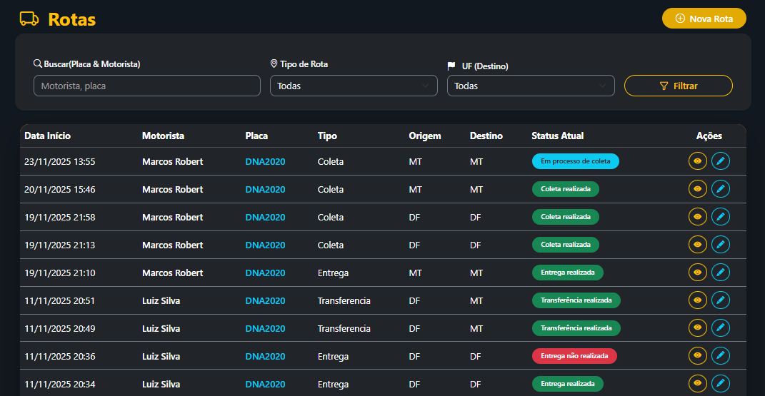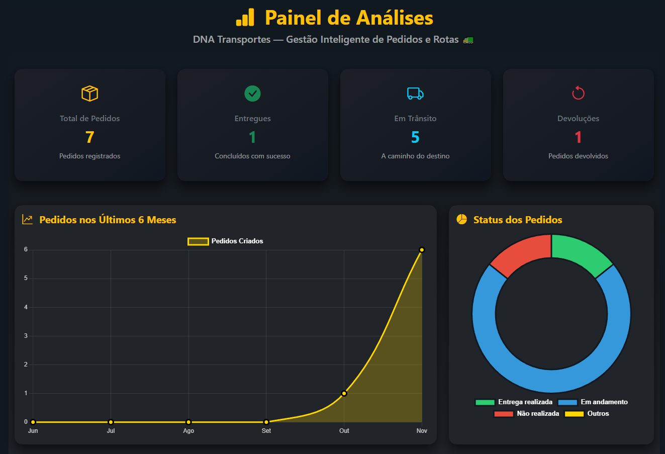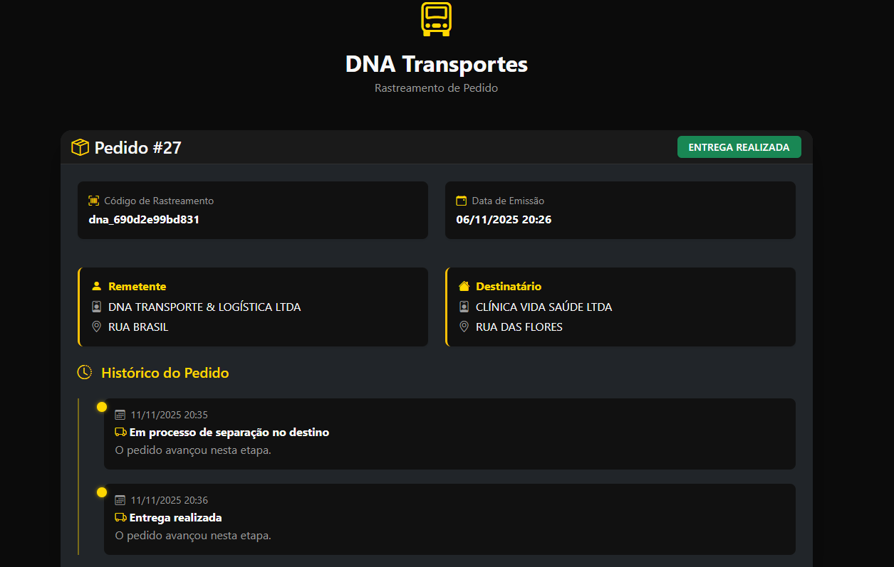 O DNA Transportes organiza a logística do pedido à entrega: cadastro, roteirização, vínculo de motorista/veículo, status e documentos — tudo rastreável e centralizado.